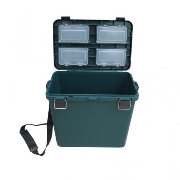 Объем ящика — 19 литров (поместятся снасти, термос, еда или пойманная рыба). В крышке ящика находятся 4 отделения с крышечками для хранения мелочей. В комлекте идет прочный ремень для переноски ящика.