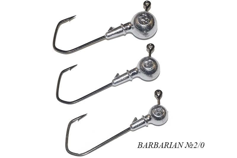 Джиг-головки Барбариан отлиты из высококачественного свинцового сплава. У выхода крючка предусмотрен шип и дополнительно юбка, которые обеспечивают надежное крепление приманки на снасти, предотвращают её [приманки] сползание. Джиг-головки оснащены качественным корейским крючком Барбариан. Строение этого крючка обеспечивает стабильное просекание пасти крупного хищника, процент схода минимален. Ушко крючка выходит из снасти под углом 120 градусов, в отличие от обычных крючков (90 градусов), что делает подъёмы и опускания приманки более плавными, естественными.