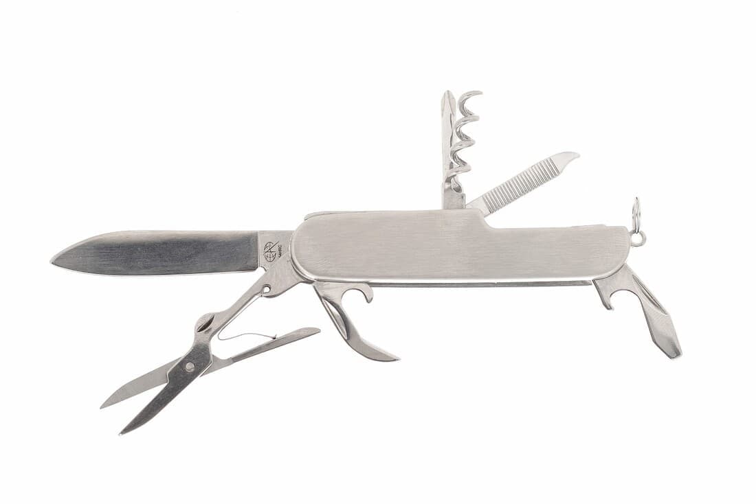 Отсутствуют. Комплектуется: ножом, ножницами, открывалкой, консервным ножом, пилкой,крестовой отвёрткой, штопором.