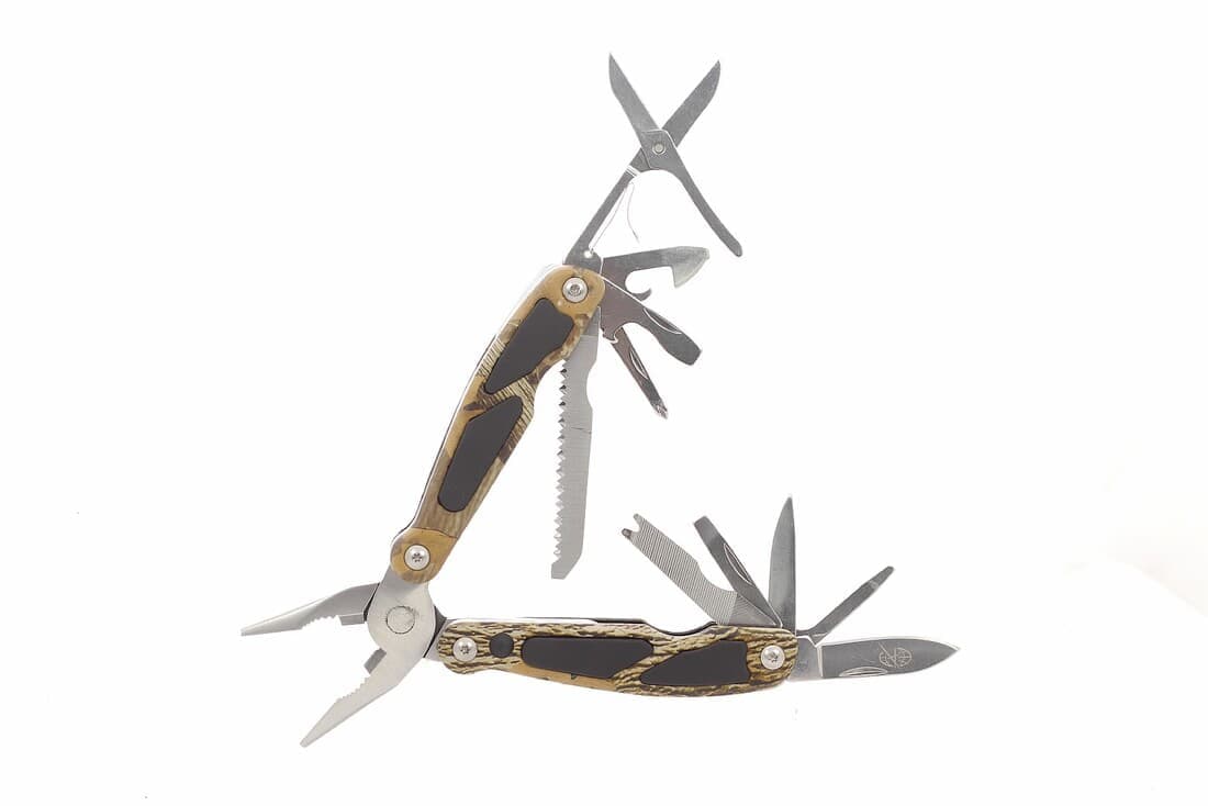 Пассатижи, нож, напильник, 2 винтовые отвёртки, шило, консервный нож, крестовая отвёртка, открывалка, пила, ножницы, светодиодный фонарь.
