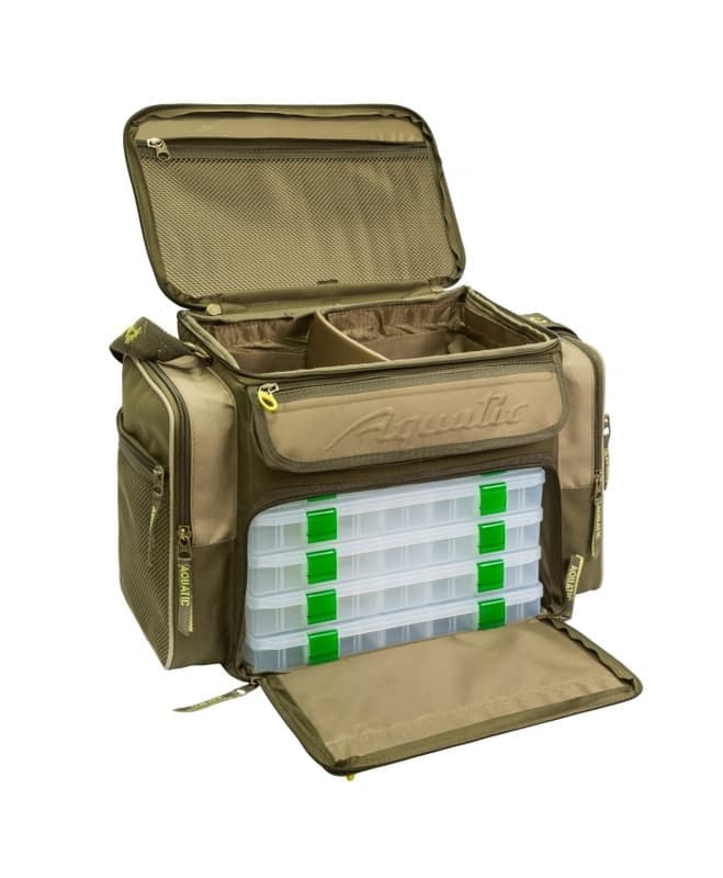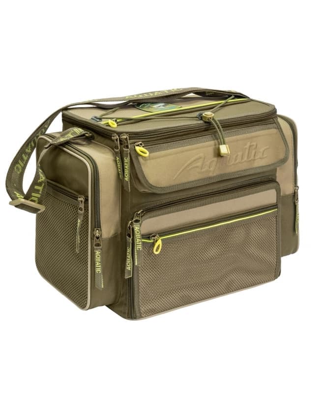 Сумка Aquatic СК-14 укомплектована 5 коробками (Fisherbox 23×31 см.) 2 коробками 19х26 см. В верхнем отделении можно хранить катушки и другие необходимые вещи. Внутрь сумки вставлены пластиковые детали, что обеспечивает жесткость и дополнительную защиту содержимого. В эту сумку помещается столько приманок и принадлежностей, сколько не поместится в пластиковый ящик значительно большими размерами. На сумке имеется светоотражающая отделка, позволяющая с помощью фонаря обнаружить сумку в темное время суток.