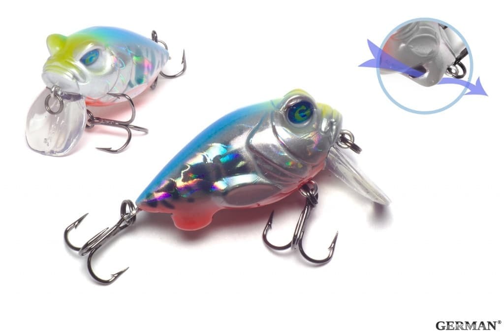 Тип: Крэнк. Этот «малыш» настоящая гроза водоёмов. Особенно применим в местах при ограниченной возможности заглубления приманки (мелководные перекаты, наличие густой растительности на дне, заливы). Воблер принадлежит к «семейству» приманок мини-крэнк, при игре голова неподвижна с интенсивным вилянием хвоста , что приводит к образованию пузырьков особенно привлекающих таких рыб как щука, жерех, голавль и окунь. Модель одна из самых громких среди множества воблеров (вся игра сопровождается выпрыгиванием из воды, возвращаясь с шумом и брызгами). Удобен в забросах, прекрасно держит любую струю. Length: 38 mm Type: floating Weight: 5 g Depth: 0.2-0.3 m