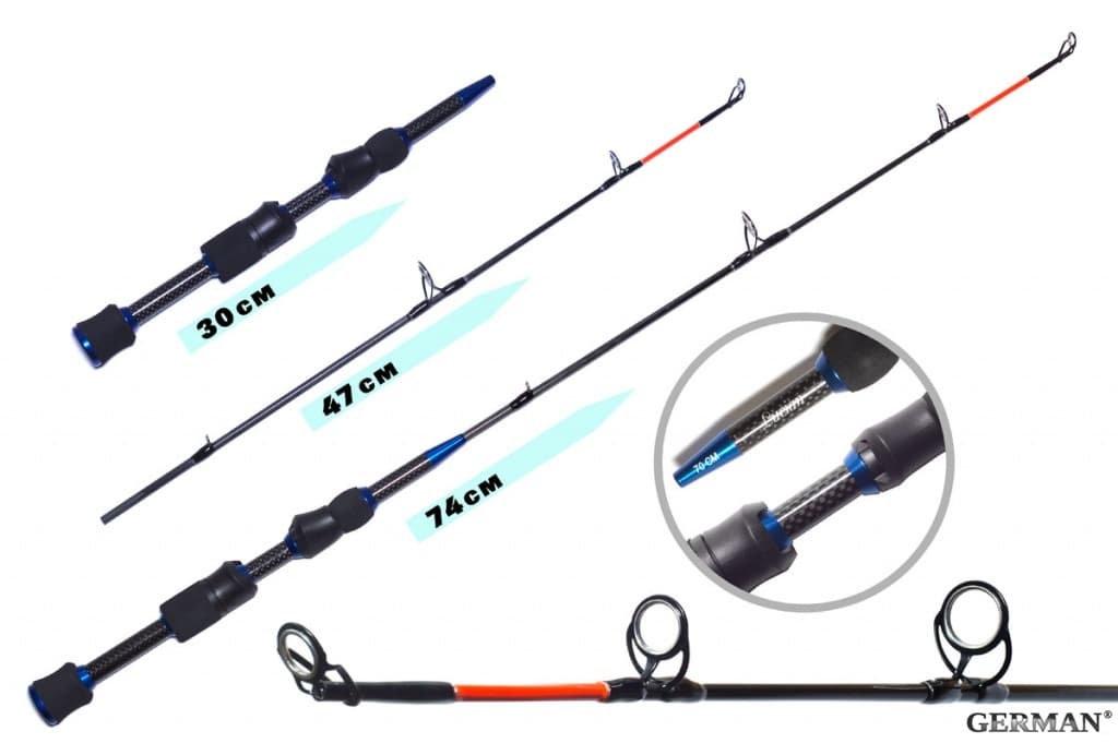Длина: 70 см. Зимняя удочка Lucian произведена из высокомодульного карбона IMG9 с прицелом на ловлю судака и в частности его ловлю на раттлины. В удочке идеально всё. Жёсткий, звонкий хлыст который оборудован невесомыми кольцами, что позволяет почувствовать травинку на крючке приманки. Катушкодержатель пришёл из мира дорогих спиннингов — он практичен и надёжен, как и разнесённая рукоять из неопрена, не дающая замерзать рукам, но при этом прекрасно передающая состояние приманки на другом конце лески. Удилище составное и формируется из двух частей: рукояти и самого хлыста. Длинна рукояти 30 см, оставшуюся длину составляет хлыстик.